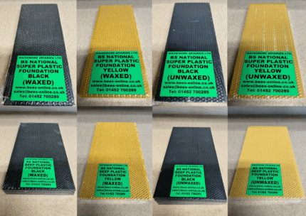 BS Deep Plastic Foundation Per 10 SHEETS, choose Yellow OR Black SUITABLE FOR NATIONAL, WBC & SMITH HIVES, SIZE = 333mm x 199mm Once the combs have been drawn they are virtually unbreakable allowing you to extract faster and if you have hard honey y6ou are able to scrape the frame back to the plastic comb. The foundation does not sit in the grooves of the side bars but simply in between the side bars.