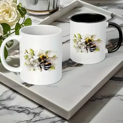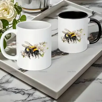 11oz Ceramic Bee Mug with White Flower Design