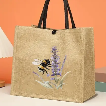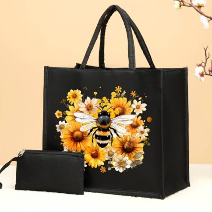 Bee on Flowers Black Jute Bag with Small Black Zipper Purse