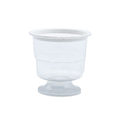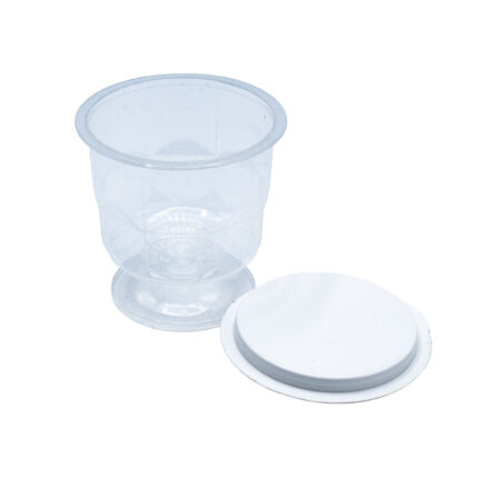 Mini honey jar with foot. Registered pattern. For presents, hotels, restaurants, sampling,… Dimensions : Ø Max 42 mm - High. 42 mm. Made from transparent polypropylene. White covers are interlockable and watertight, with a small strip for the opening of the jar.