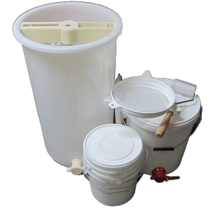 2 FRAME PLASTIC EXTRACTOR 60LB PLASTIC HONEY TANK & TAP UNCAPPING ROLLER 3 x 15LB PLASTIC HONEY BUCKETS NYLON DOUBLE STRAINER.