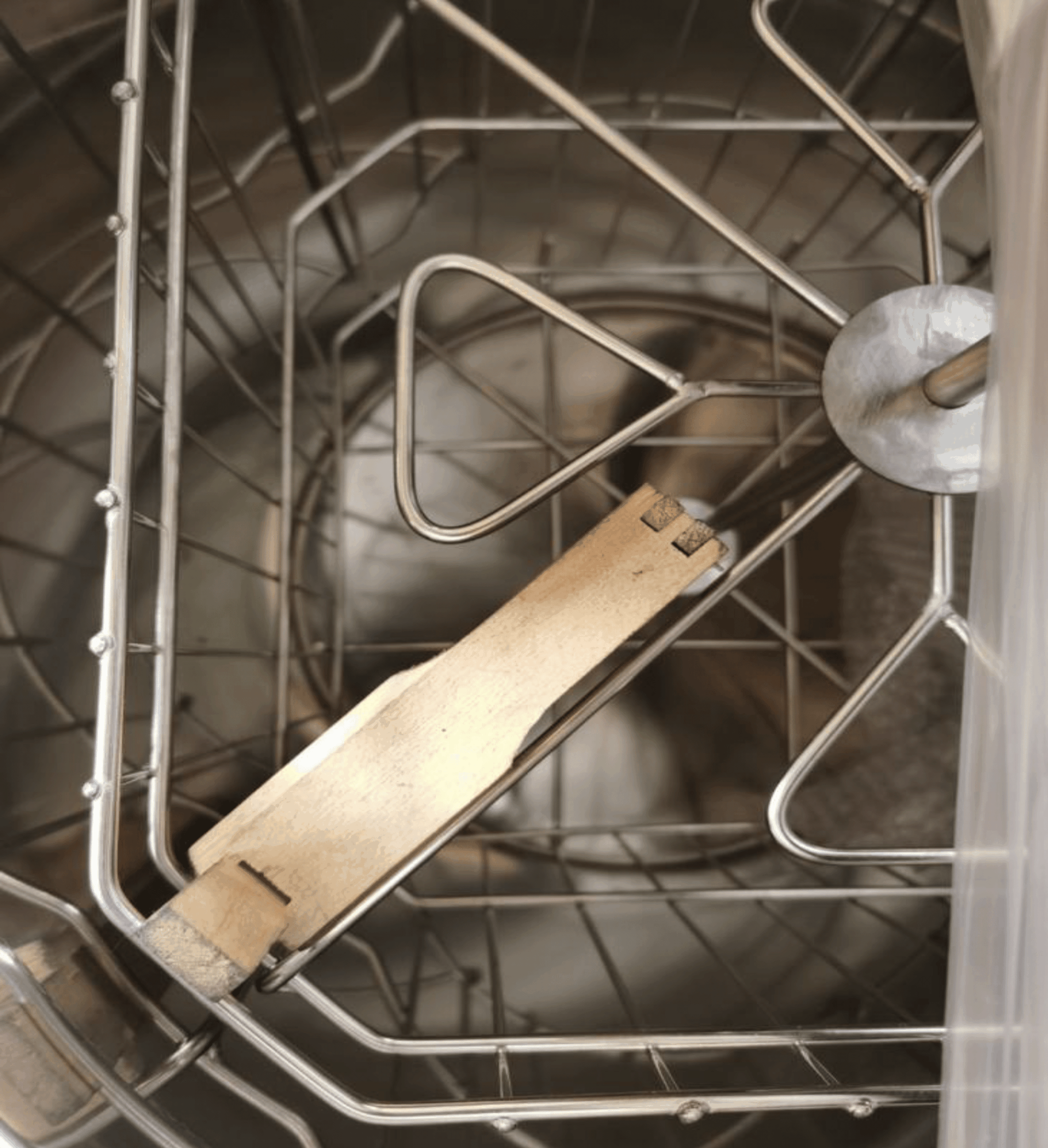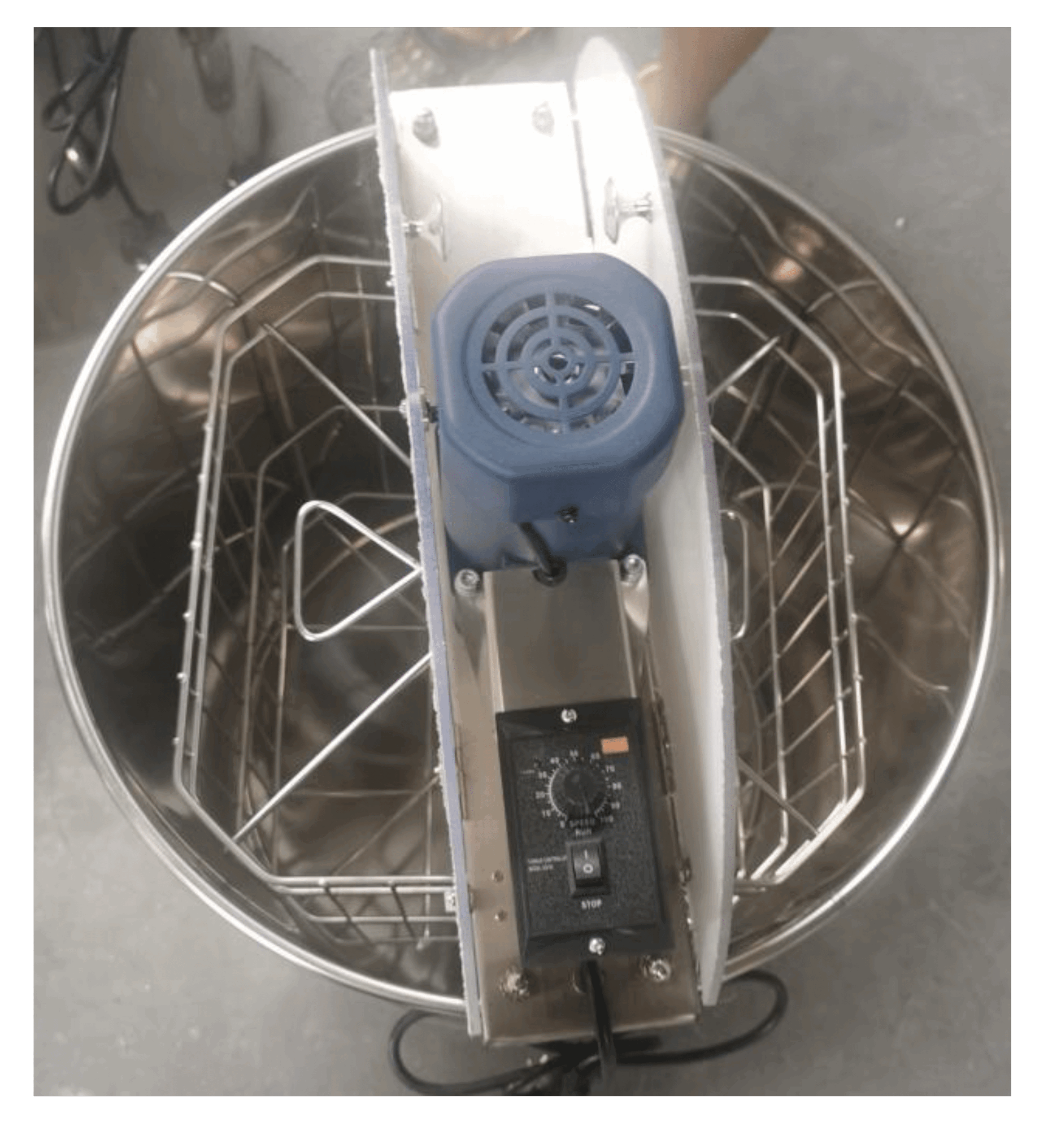 Budget 4 Frame Stainless Steel Tangential Extractor (Electric) with Speed Control, comes with legs and a Nylon (plastic) honey gate. There is 39cm from floor to bottom of tank, Will take BS Deep and BS Shallow Frames and BS Manley Shallow Frames. WILL NOT TAKE 14×12 FRAMES