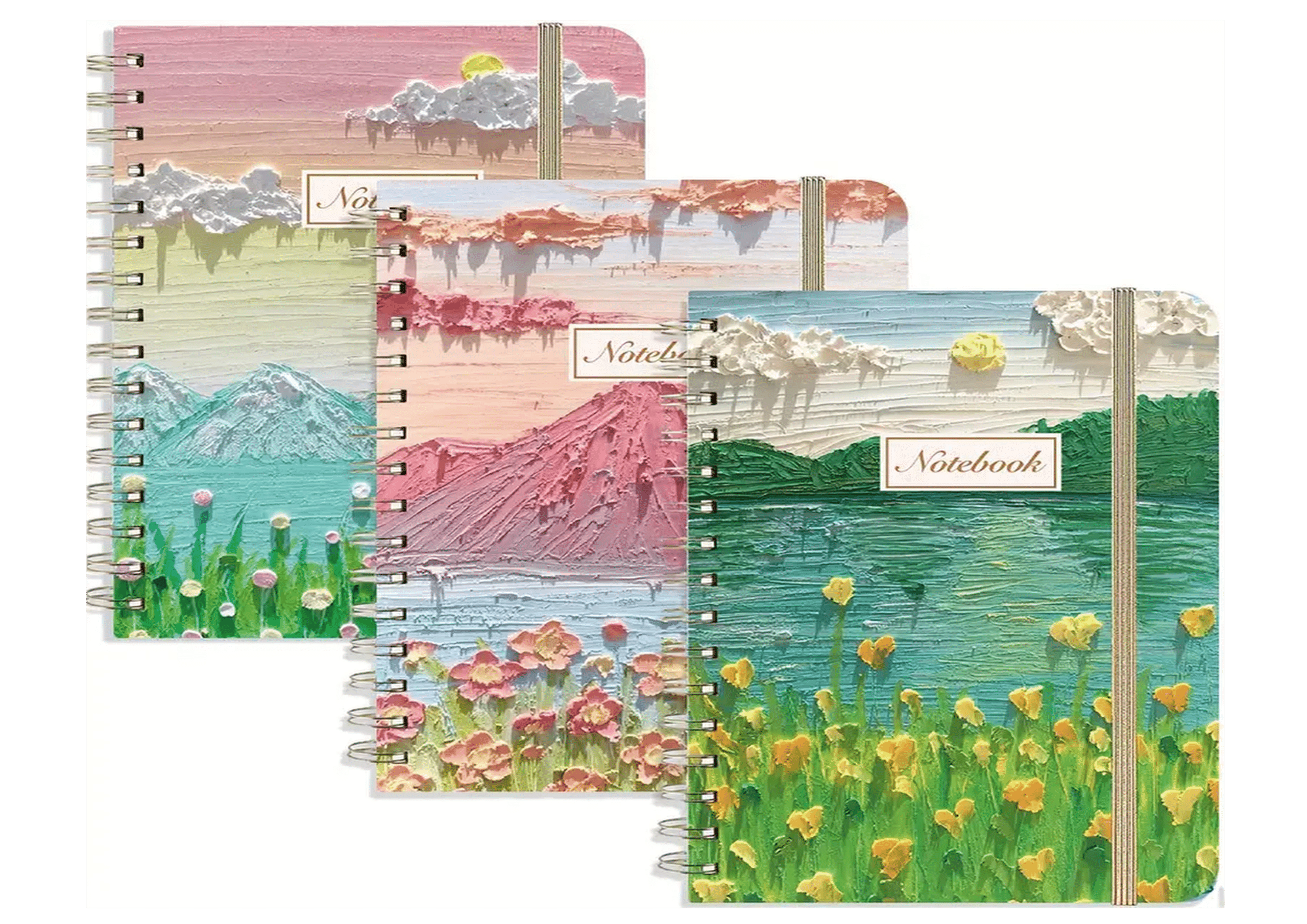 Notebook 1 Blue Mountains Pink Sky ,Notebook 2 Pink Mountains Blue Sky ,Notebook 3 Green Mountains Cream Sky |