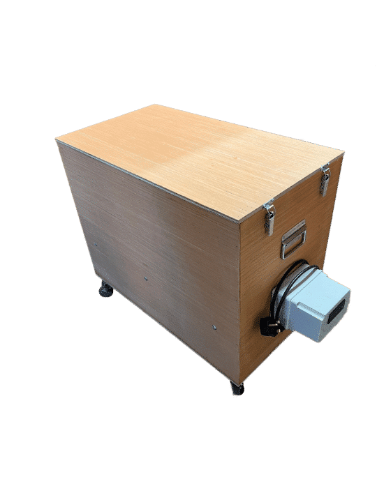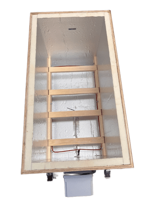 Will hold 2 x 30lb buckets of honey, the heat is provided by 100 watt heating cable, there is a stainless expanded mesh grid (68cm long x 1.7cm high x 33.5cm wide) available which will hold jars of honey at an additional cost and an upgrade of 4 heavy duty lockable swivel castors.