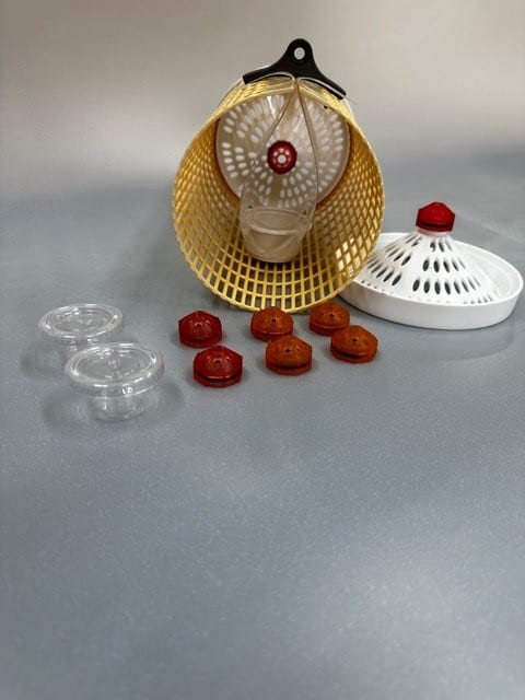The traps have been designed and developed in the field in France by beekeepers. The design has under gone 26 iterations so that it only catches Asian hornet queens and workers. By-Catch is reduced to a minimum by using two different sized nozzles, the red nozzle is used to catch queens in the spring and autumn and the orange nozzle to catch workers during the summer