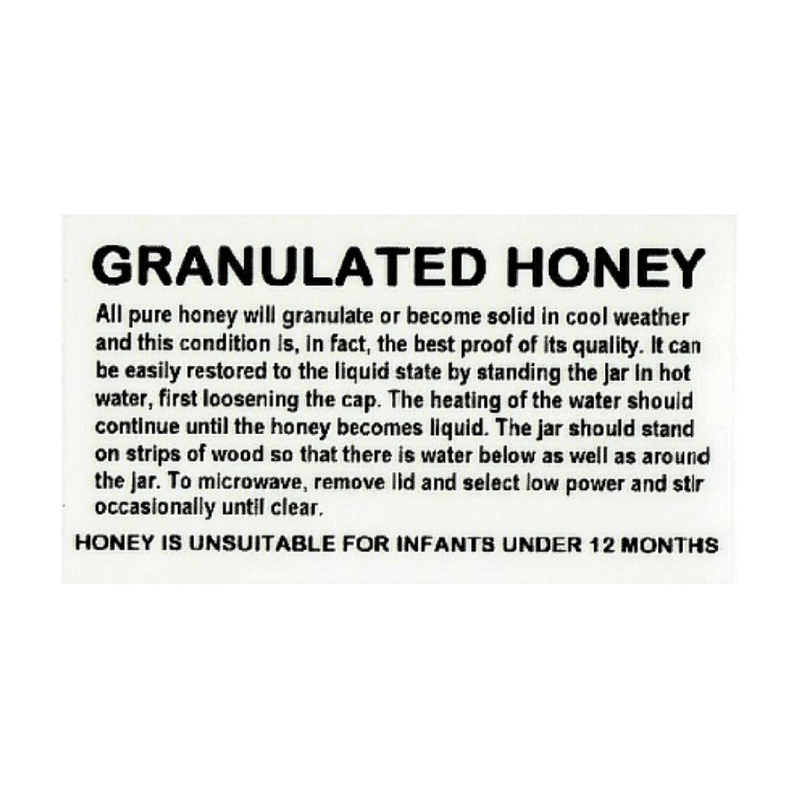 The wording says:- All pure honey will granulate or become solid in cool weather, and this condition is, in fact, the best proof of its quality. It can be easily restored to the liquid state by standing the jar in hot water, first loosening the cap. The heating of the water should continue until the honey becomes liquid. The jar should stand on strips of wood so that there is water below as well as around the jar. To microwave, remove lid and select low power and stir occasionally until clear. HONEY IS UNSUITABLE FOR INFANTS UNDER 12 MONTHS.