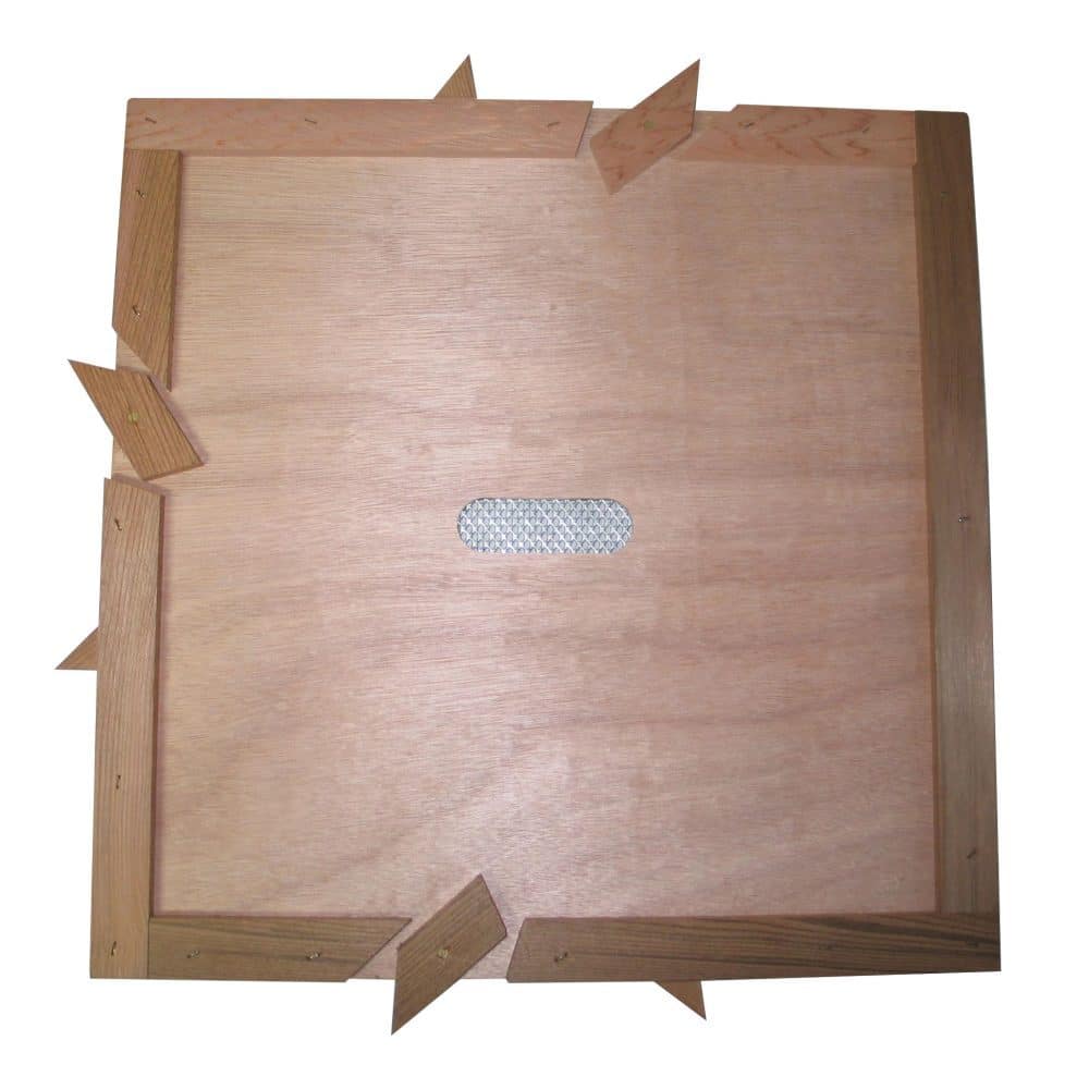 Available for NATIONAL, COMMERCIAL or WBC hives, this is our preferred method of clearing our bees, a simple 6mm plywood board in a wooden frame with a large hole drilled centrally and fixed with a rhombus escape, there are no moving parts so there is nothing to be clogged by the bees.