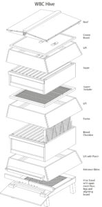 The WBC hive is a double-walled, weatherproof hive with sloping external “lifts” that protect a more standard set of internal boxes.